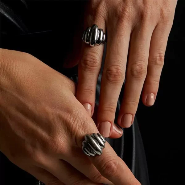 Os gomos curvos deste anel criam um efeito visual deslumbrante, enquanto a superfície lisa reflete a luz de maneira encantadora. Com um aro de tamanho 16, ele se adapta confortavelmente ao seu dedo, tornando-se um acessório essencial para qualquer ocasião.