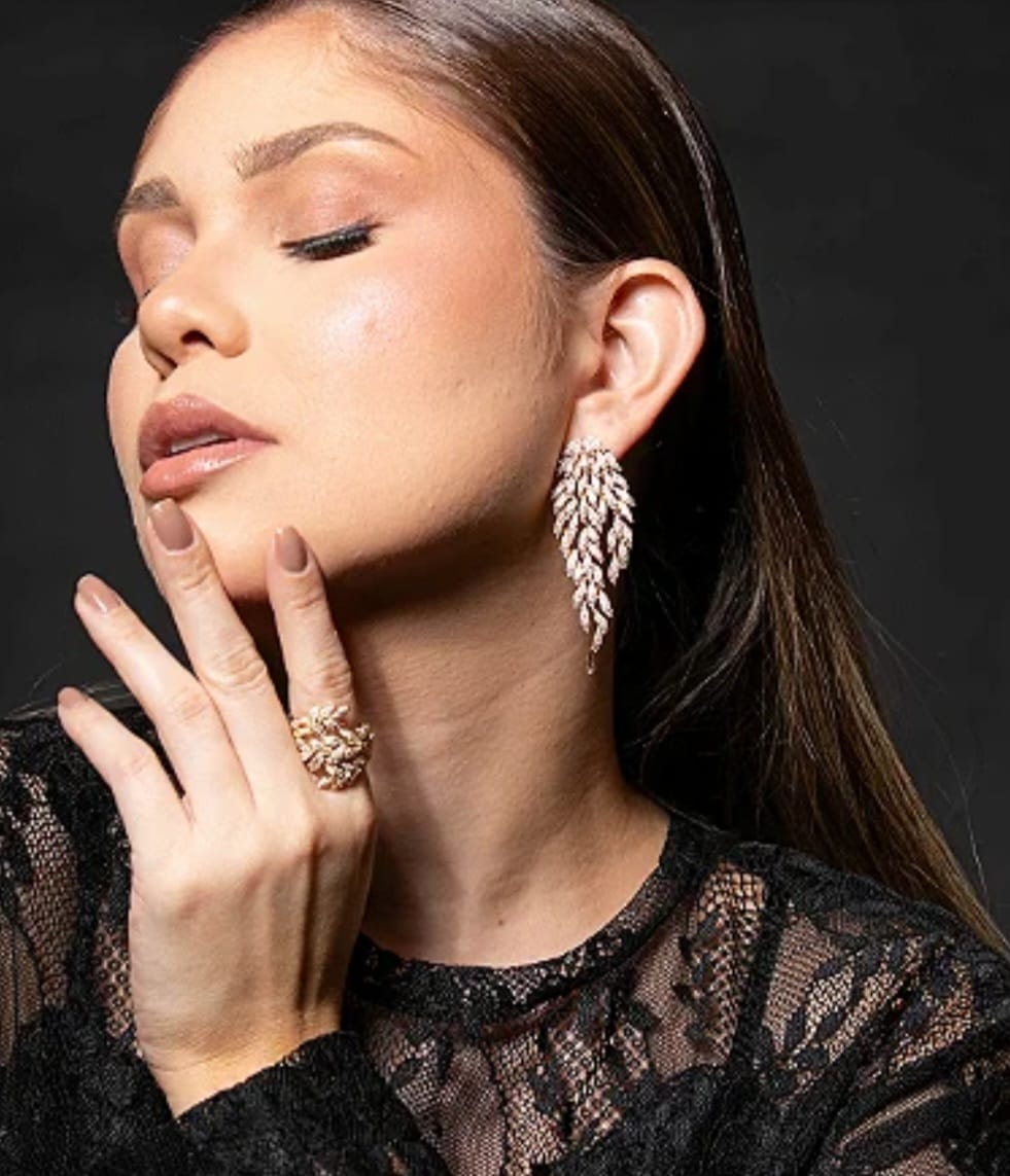 O Conjunto de Brinco e Anel Cravejado com Zircônias Cristal Banhado a Ouro 18K é uma peça de luxo inspirada na alta joalheria. O brinco, de tamanho médio e formato pêndulo longo com escamas totalmente cravejadas, reflete luz em todos os ângulos, criando um efeito de impacto e sofisticação.