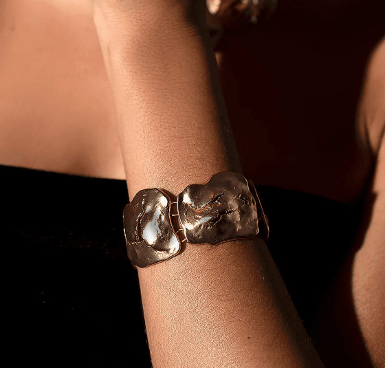Esta pulseira martelada com design orgânico é uma peça statement que exala força e sofisticação. Seu acabamento artesanal com textura martelada e detalhes vazados cria um efeito único e contemporâneo, ideal para mulheres que buscam acessórios marcantes e cheios de personalidade.